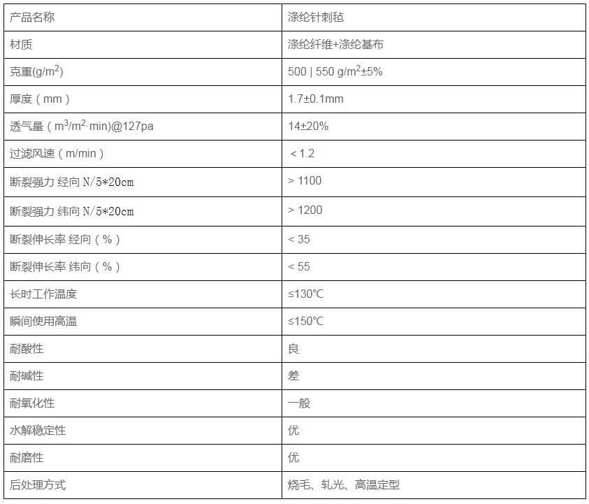 滌綸除塵布袋具有普通氈類濾布_的空隙空高、透氣性好、集塵效率高、使用壽命長等優點。其耐溫等級適中,瞬間可達150℃,耐酸、耐堿適中,而且具有非常好的性能。